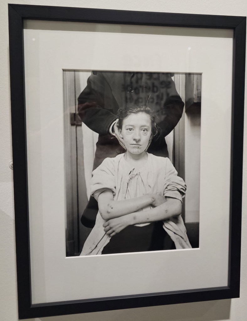 Emilie Bernard : C’était notre volonté de départ, avec toute la complexité de faire coexister, comme vous le dites, des regards contemporains avec des pièces historiques sans savoir si la cohabitation allait fonctionner… C’était quand même un pari, nous voulions tenter autre chose qu’une présentation historique chronologique d’un côté et les travaux contemporains d’autre part. Nous avons travaillé la scénographie au service de cette mise en dialogue des regards. Nous avons conçu cette partie centrale avec des cimaises un peu en décalé, et des grandes vitrines, qui présentent cette partie historique et documentaire et ces différents usages de la photographie : la photographie médicale, une photographie au service du soin et du diagnostic, le photojournalisme, une photographie quotidienne. Et cette partie centrale est entourée par les regards de photographes contemporains, sur les murs du pourtour de la salle. A chaque fois nous avons essayé de placer face à face des choses qui pouvaient se répondre, frictionner, en tout cas pour qu’il se passe quelque chose. Notre idée était vraiment par cette confrontation, de rendre sensible et tangible pour le public la question des différents regards posés sur le sujet par la photographie, de rendre sensible la posture du photographe, et questionner la stigmatisation des représentations.