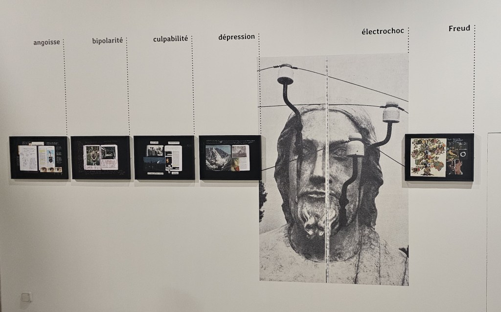 IIl vient de terminer une thèse en recherche-création sur la ville de Tonnerre et les déplacements internes de personnes précarisées, croisant photographie et sciences sociales sur ces questions-là. Il a mené des entretiens avec plusieurs personnes précarisées, qui peuvent passer par des parcours de soins psychiatriques. Son travail, s’appelle « A balles réelles » et a été présenté à Tonnerre en juin 2024, sous forme d’une exposition qui marque l’aboutissement de sa thèse. Une des personnes qu’il a rencontrées est Olivia. Il nous a proposé de faire une installation sur le grand mur de la fin de l’exposition qui raconte visuellement, comme une sorte de carte mentale, comment, entre un photographe et une personne photographiée, créer une relation la plus équitable possible et comment aller vers une co-création d’images. Une image qui servent aussi bien les intérêts du photographe que ceux de la personne photographiée. C’est une installation qui est assez complexe. Il nous montre les images intermédiaires, une chronologie aussi, parce que le travail s’est développé sur un temps très long, avec beaucoup de petits textes et de lignes qui matérialisent le réseau de relations et les échanges entre eux, ainsi que le contexte. Cette installation rend compte de la complexité de créer cette relation équitable dans ce cadre-là. Et puis, cela pose aussi en guise de conclusion et d’ouverture la question « et après l’hôpital psychiatrique ? »